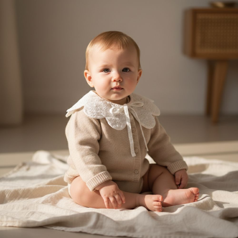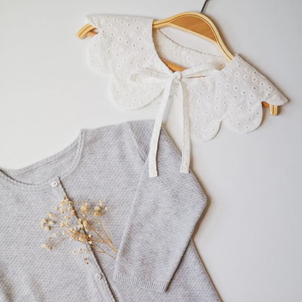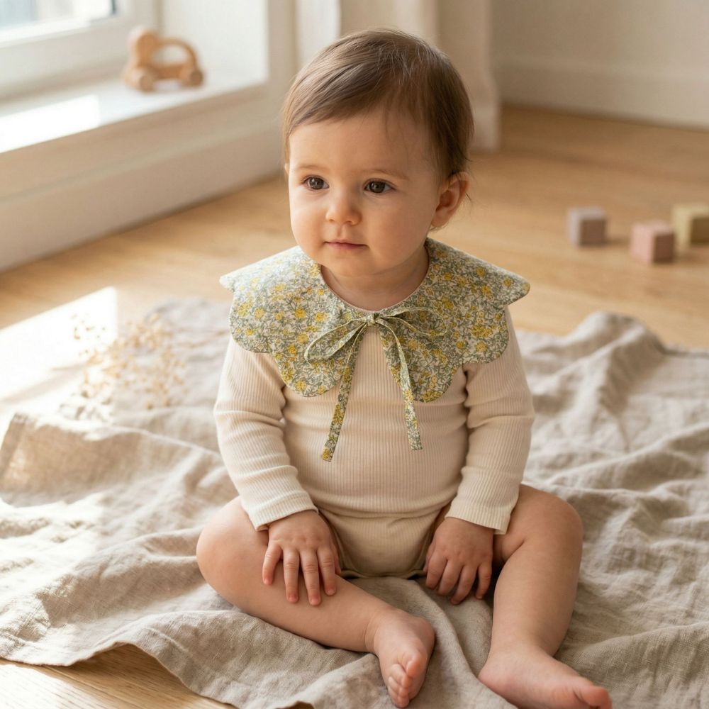 Glissé sur un body, noué sur un gilet ou posé sur une blouse, ce col vient encadrer le visage de votre bébé comme une fleur qui s’ouvre. La silhouette devient instantanément plus élégante, plus travaillée, plus poétique.