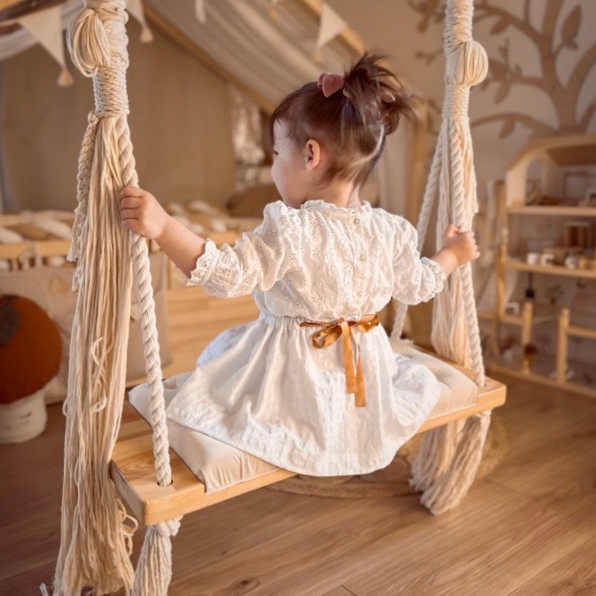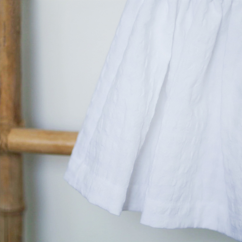 Confectionnée en seersucker gaufré vichy blanc ton sur ton, une matière aérienne et subtilement texturée, elle allie confort et charme intemporel. Son tissu 100 % coton bio, léger et respirant, accompagne les mouvements des petites aventurières avec fluidité.