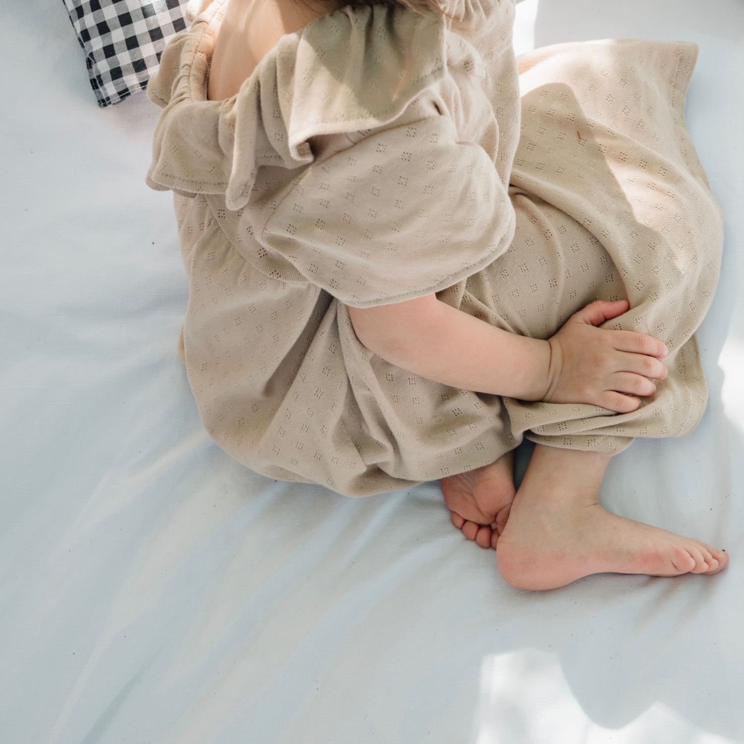 Matières : Jersey ajouré 100% coton certifié Oeko-tex® coloris Sable et Thermoflex certifié Oeko-tex® pour l’étiquette de la marque et de la taille ainsi que les conseils d’entretien.