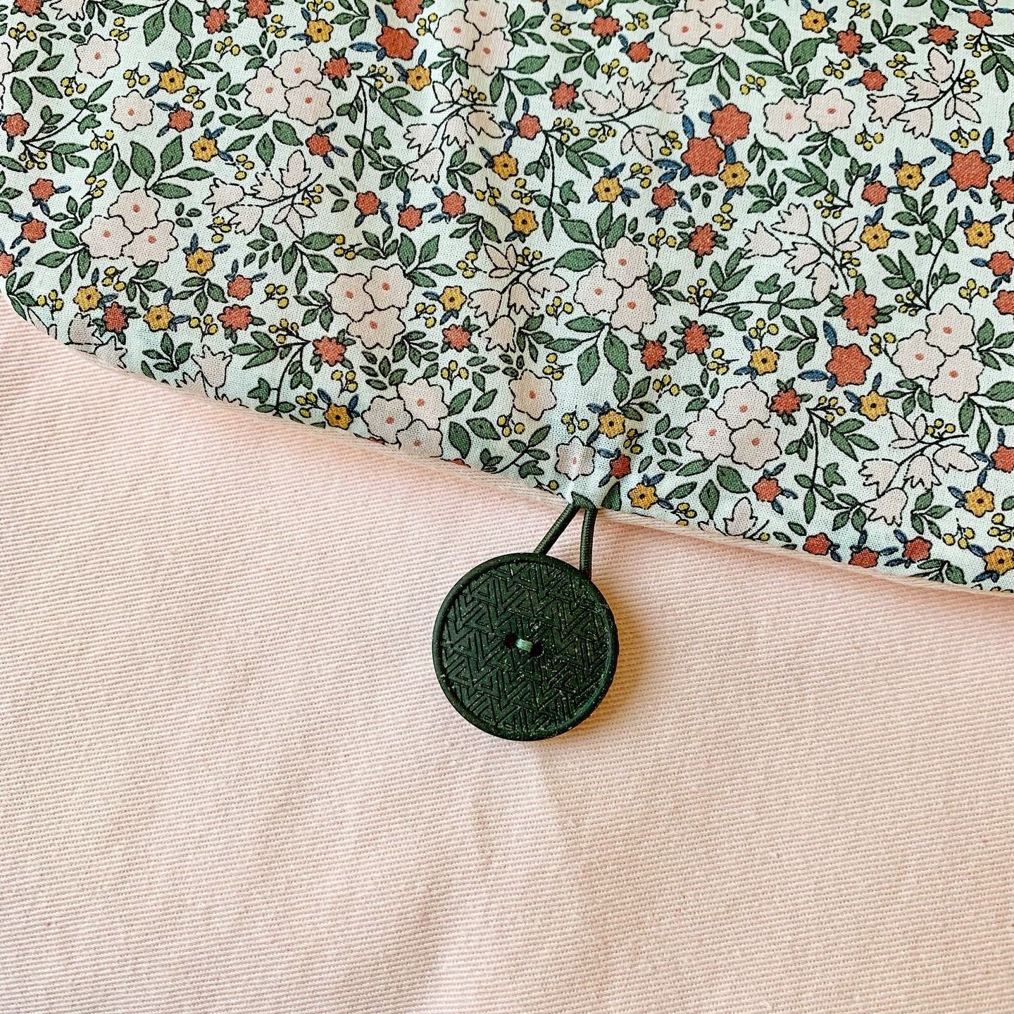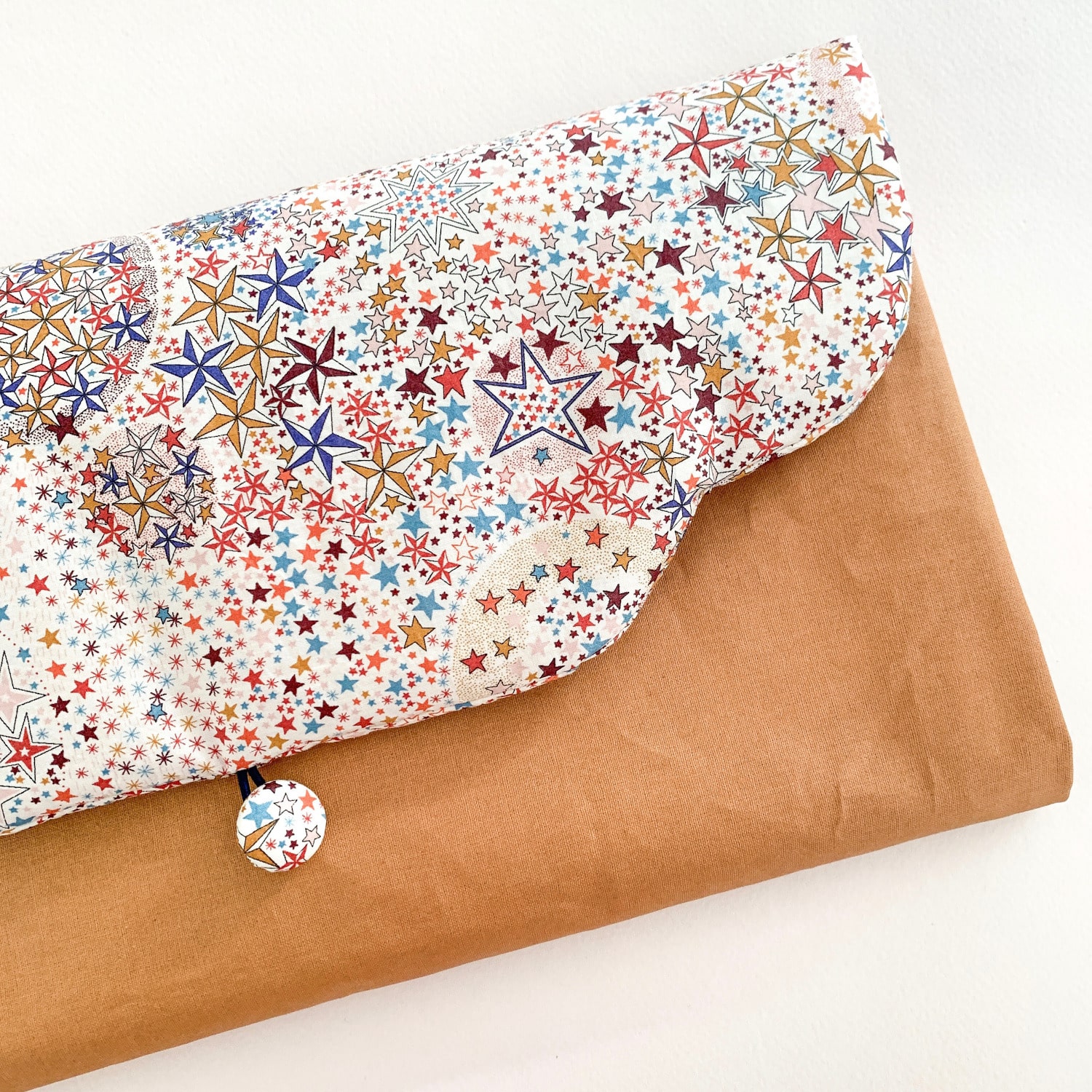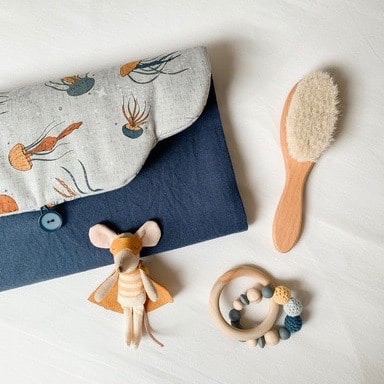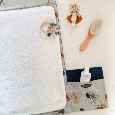 Matières : Tissus 100% coton certifiés Oeko-tex®, Tissu éponge 100% coton certifié Oeko-tex®, Tissu PUL 100% polyester recyclé pour le côté imperméable de la serviette à langer, Ruban élastique, Bouton métallique recouvert de tissu, Boutons pression plastiques et Thermoflex certifié Oeko-tex®.